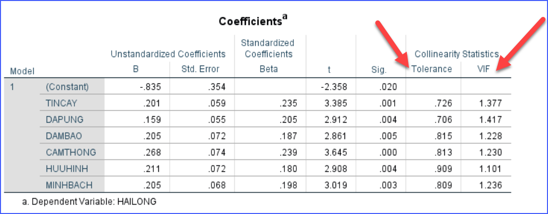 Đây là bảng quan trọng nhất để kiểm tra đa cộng tuyến. Giá trị VIF này dưới 2 là yên tâm rồi nhé.