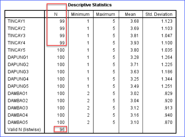 Tuy nhiên, nếu một biến quan trọng bị thiếu quá nhiều, hoặc tình trạng thiếu tập trung vào một nhóm đối tượng cụ thể (ví dụ chỉ sinh viên năm cuối bỏ trống, chỉ nhóm thu nhập thấp không trả lời), thì bản chất mẫu nghiên cứu đã bị méo. Trong những trường hợp này, Cronbach’s Alpha vẫn có thể cao, EFA vẫn có thể chạy, nhưng kết quả không còn đại diện cho tổng thể nghiên cứu. Đây là lỗi rất khó phát hiện nếu chỉ chăm chăm nhìn vào bảng output của SPSS. Tuy nhiên khi dùng thống kê mô tả có thể biết được biến nào bị thiếu, và tổng số mẫu hợp lệ còn lại là bao nhiêu.